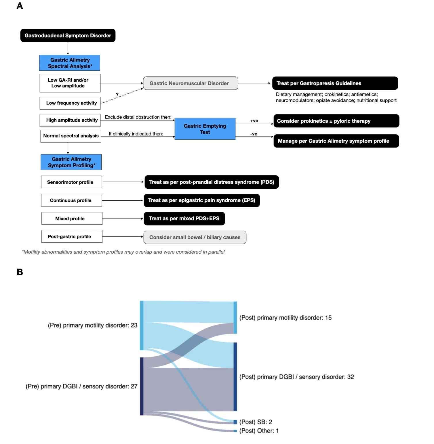 Within the sample 90% were female, median age 30 years, predominant symptoms of nausea/vomiting 72%. 70% had previous GET. Primary diagnoses prior to GA were gastroparesis/other dysmotility in 46%, or disorder of gut-brain interaction (CNVS/FD) in 54%. GA aided management in 78%. 40% of patients changed primary diagnosis, typically being a switch from a primary motility disorder to a primary DBGI/sensory disorder of vice-versa, or to a small bowel phenotype, as based on GA analysis (Figure 1B).1 Therapeutic changes favoured neuromodulators in 36%, prokinetics in 28%, with 2 patients receiving pyloric interventions, and other medications in 14%. Of 9 patients on invasive nutrition prior to evaluation, 5 were successfully weaned from PN, and 3 from enteral feeding, after diagnosis and medication changes facilitated tolerance of oral diet. Conversely, nasojejunal feeding was initiated in one patient with a new diagnosis of a neuromuscular disorder.